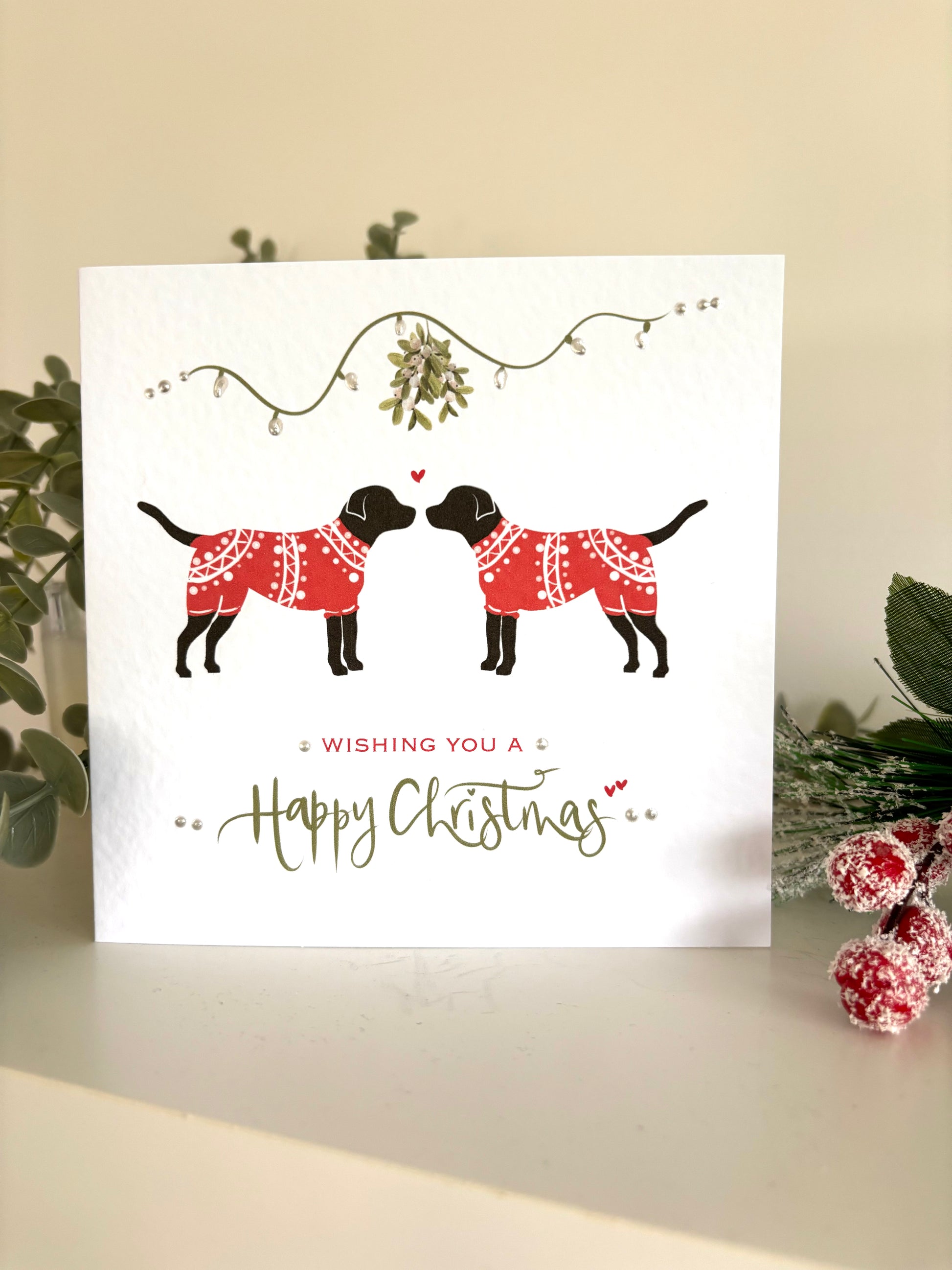 This cute and cheerful card featuring an adorable pair of Labradors in their Christmas jumpers saying Happy Christmas is the perfect way to send your festive wishes at Christmas time.