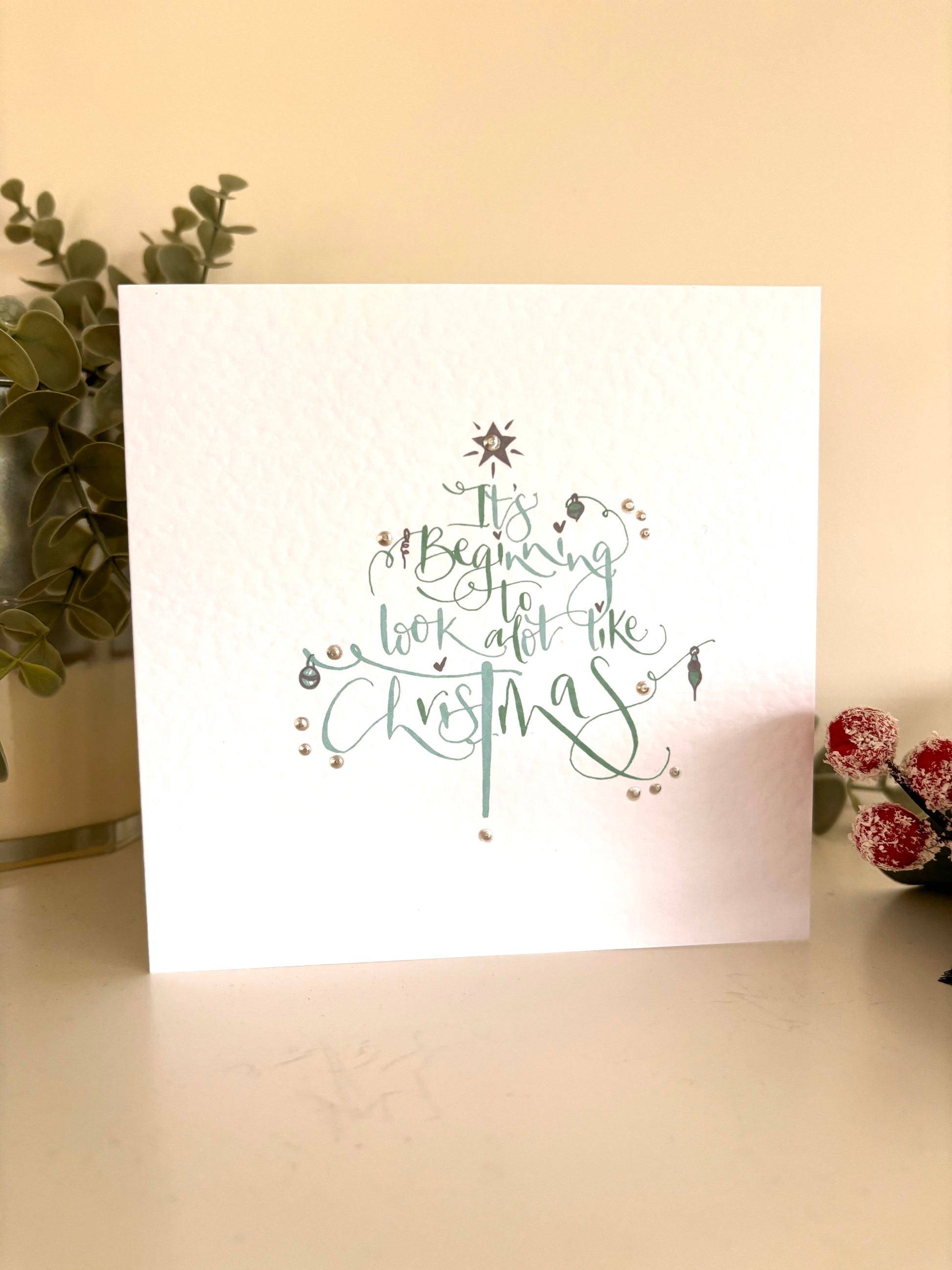 These beautiful cards featuring a Christmas Tree cleverly designed from the Modern calligraphy words 'It's Beginning to look a lot like Christmas', are the perfect way to send your festive wishes at Christmas time.