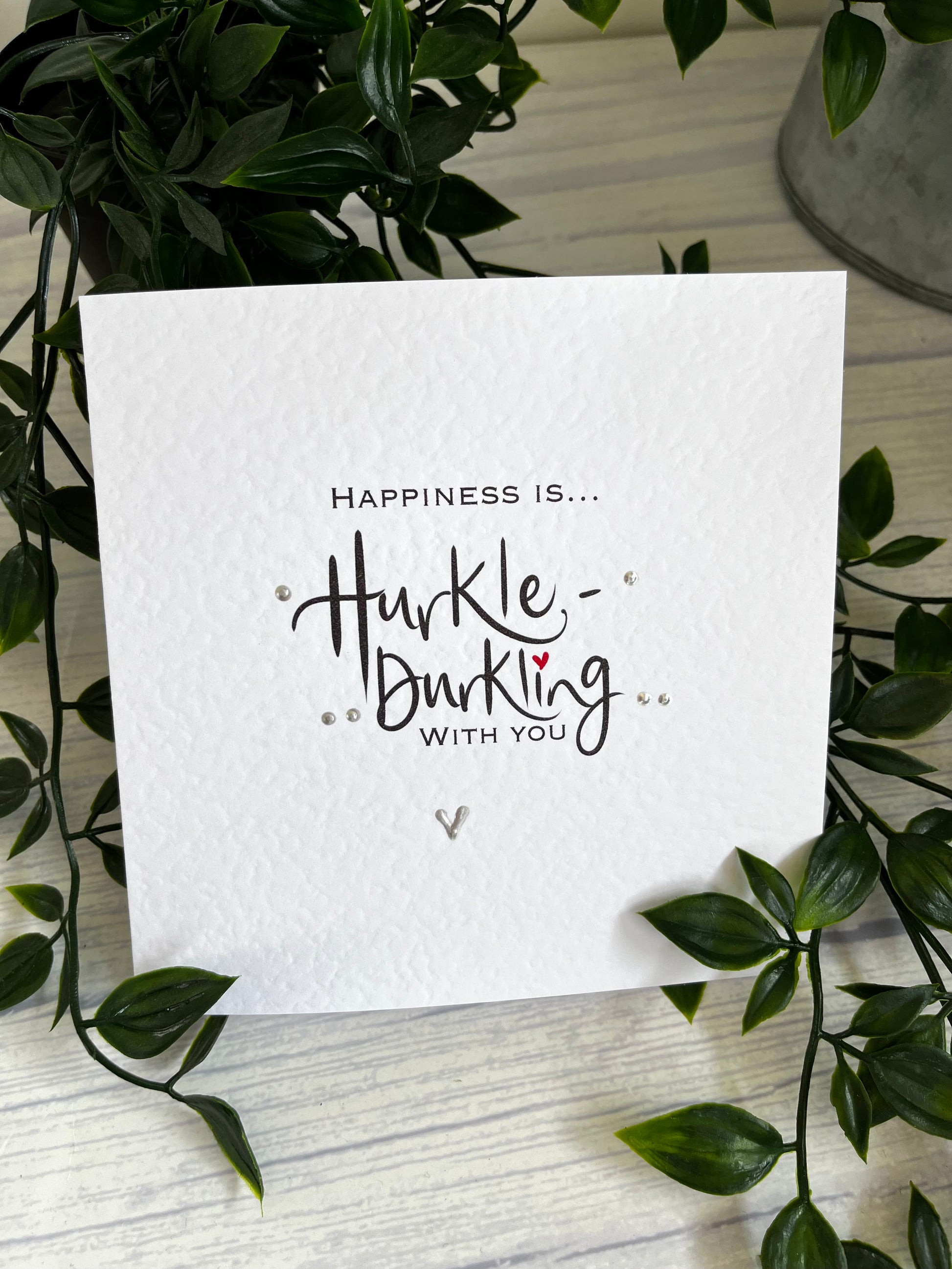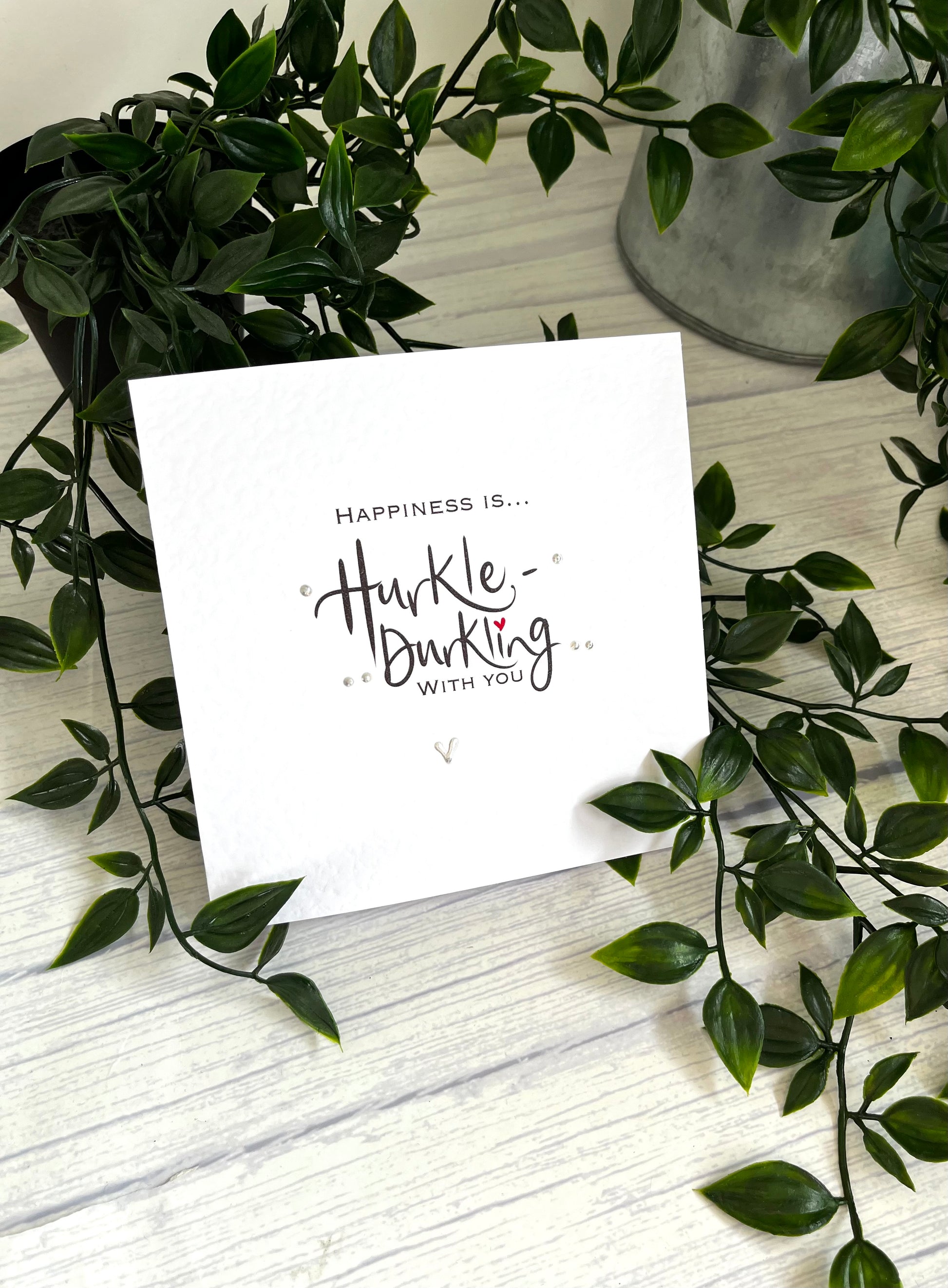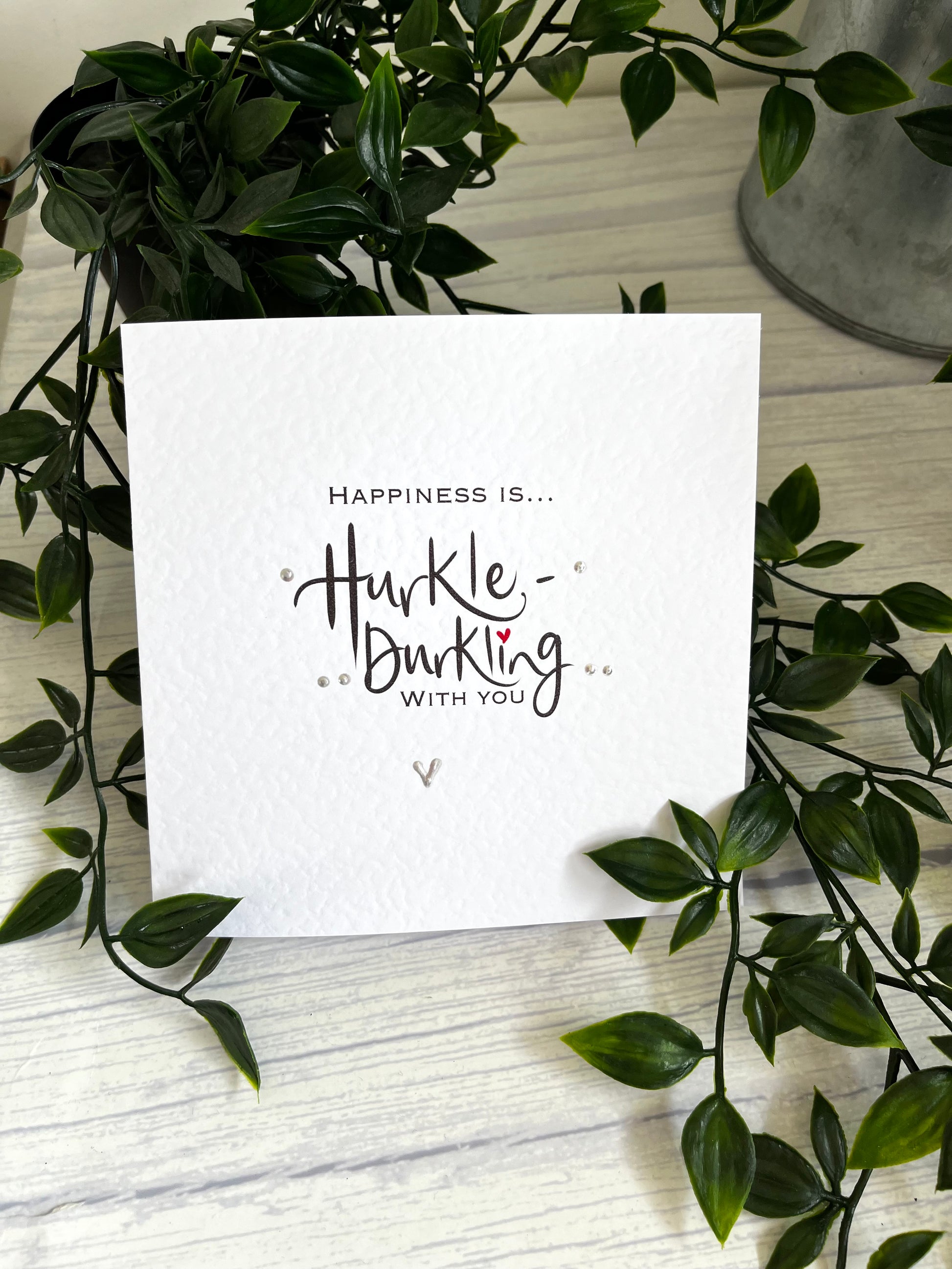 Our card features a gorgeous message with ‘Happiness is Hurkle-Durkling with you’, expressing your love and devotion. Hurdle-Durkheim is a 200 year old term meaning to stay in bed longer than you should! This card is perfect to show your love to your special someone, perfect for Valentine’s Day.