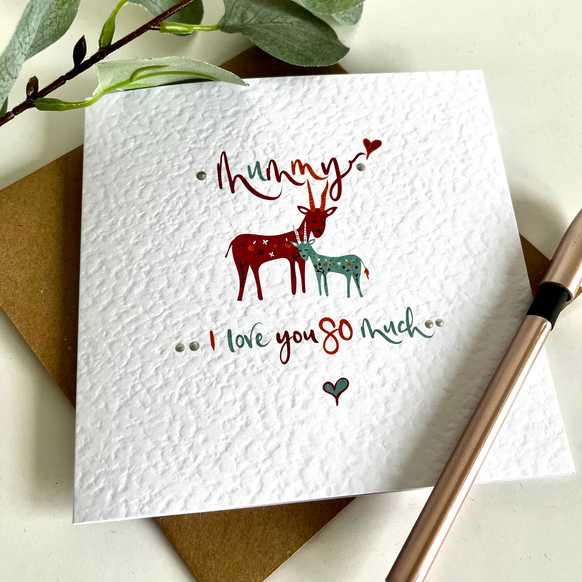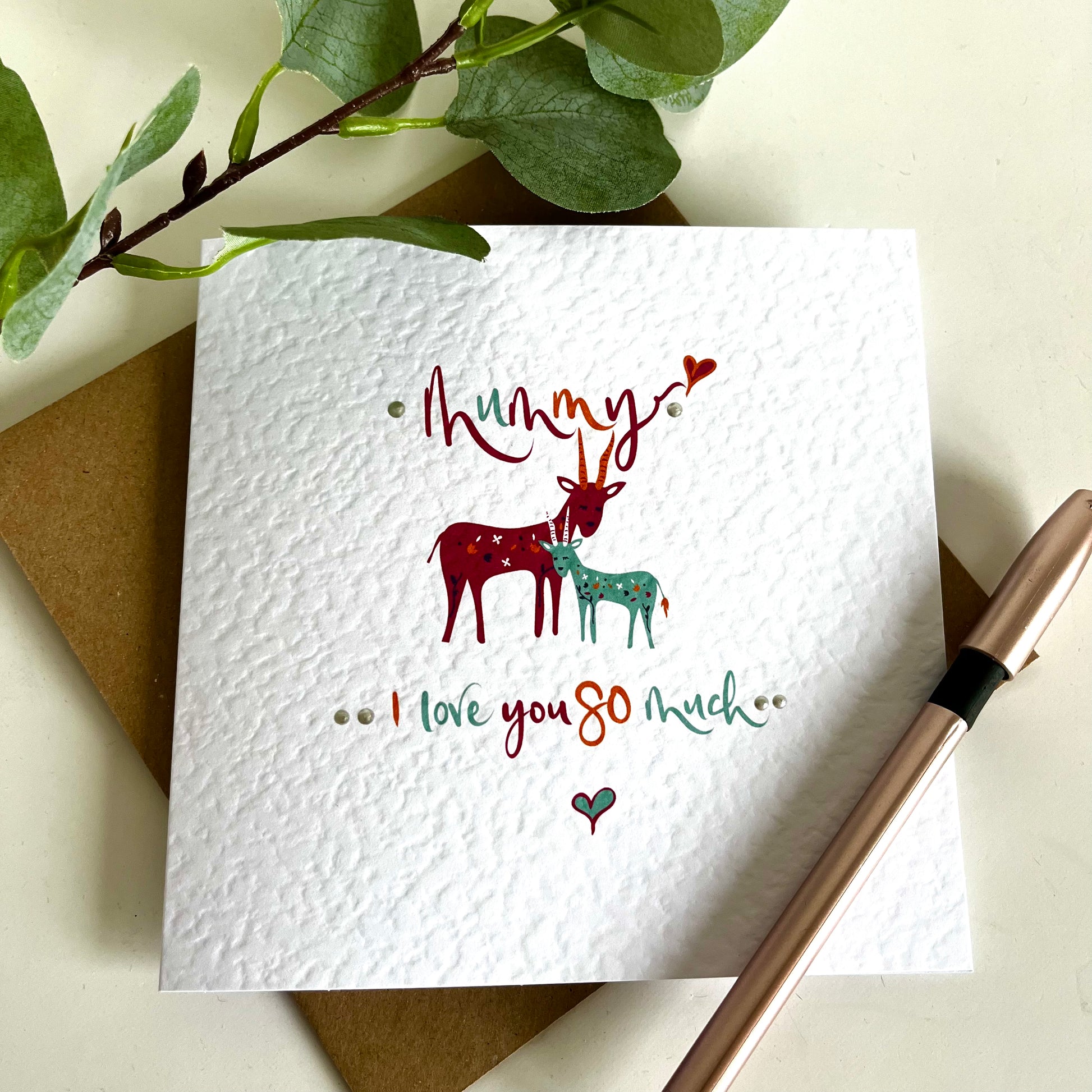 This eco-friendly card is illustrated with simple contemporary design of Mummy nd Baby deers and is printed with hand lettered wording 'Mummy, I love you so much'.