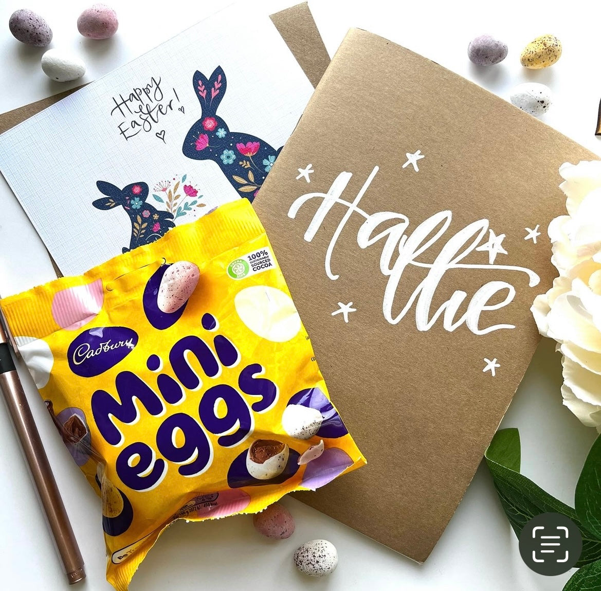 Personalised notebook, mini eggs and a handwritten Easter card