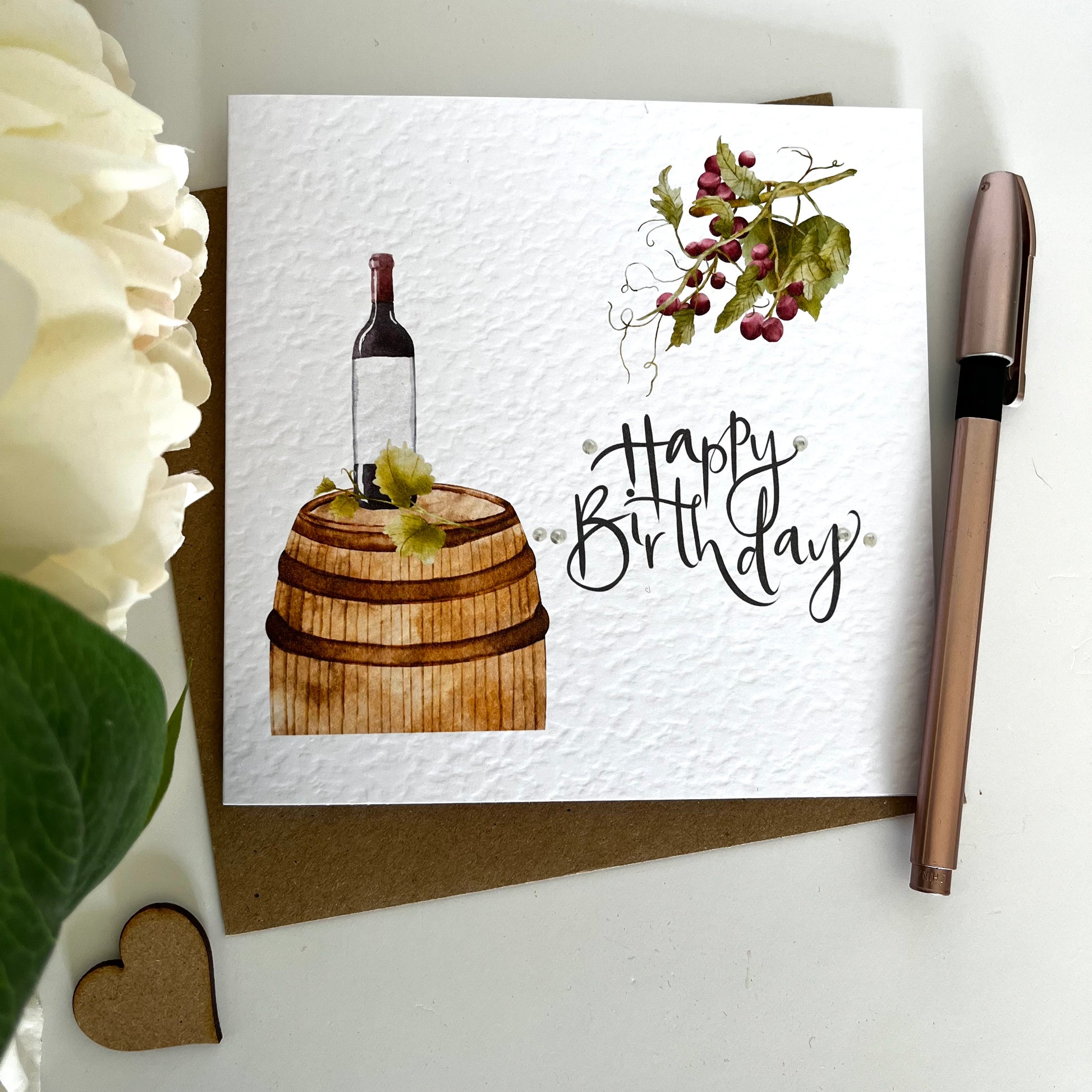 Send a sophisticated stylish hand-lettered sustainable birthday card featuring a wine bottle, barrel and grapes making it the perfect card to send to the wine lover in your life.