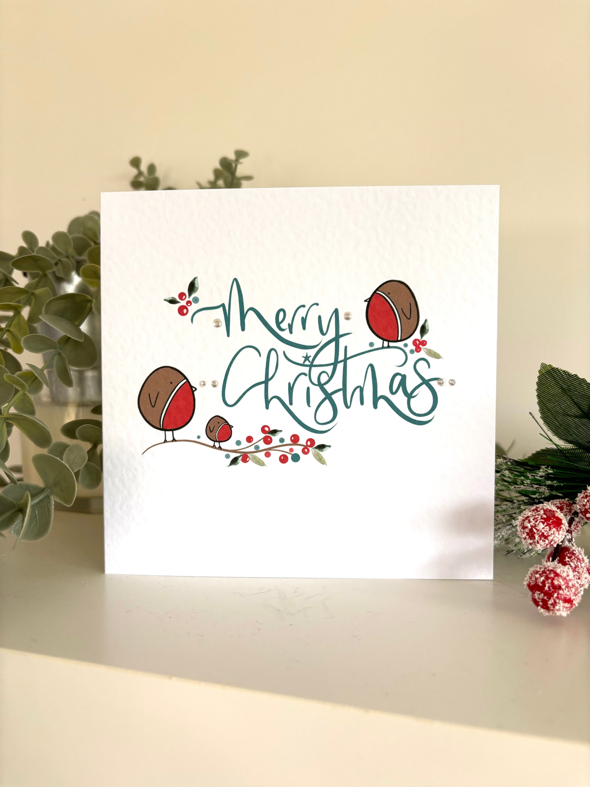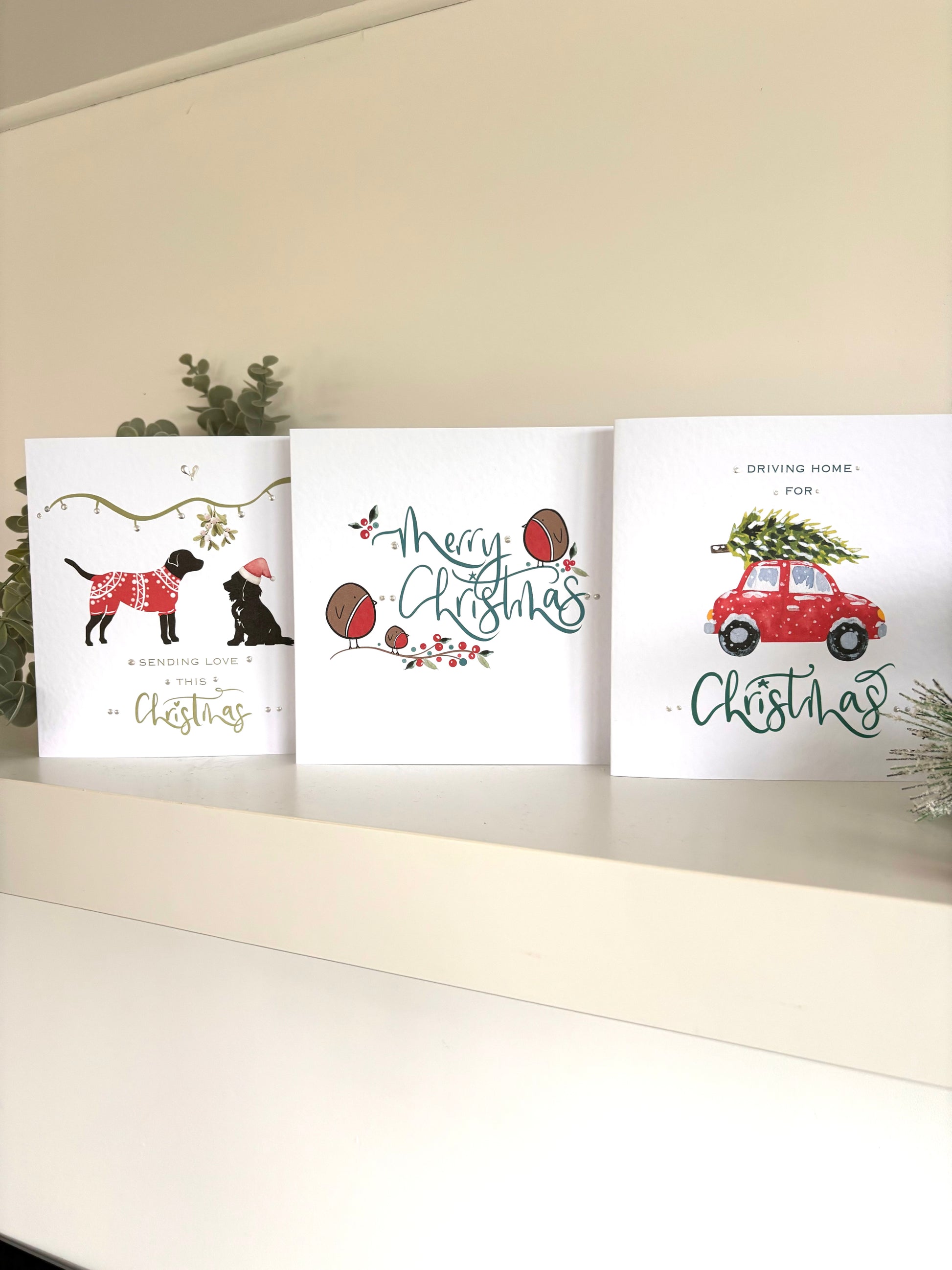 Mixed pack of 6 beautiful 6“ square original hand designed Christmas cards, with 2 of each of these bright designs each individually finished with silver dots.