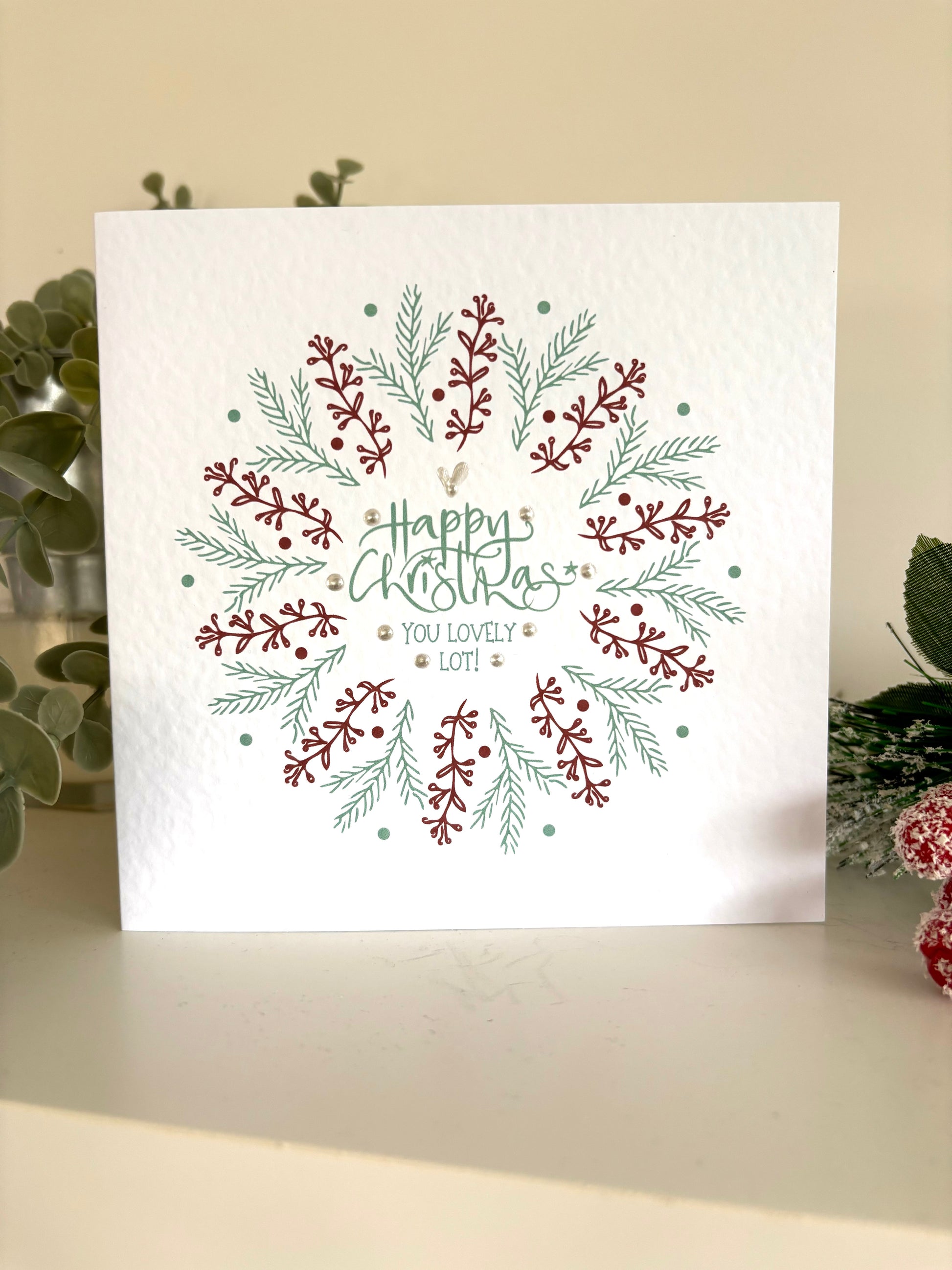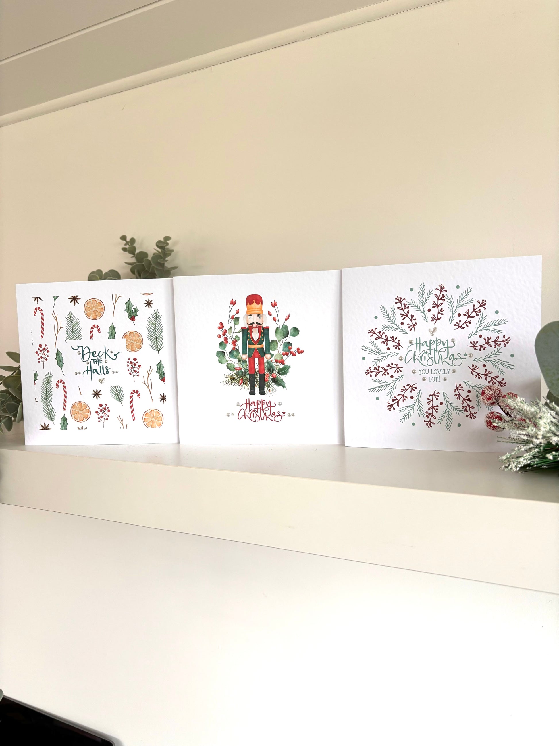 Mixed pack of 6 beautiful 6“ square original hand designed Christmas cards, with 2 of each of these beautiful contempoary designs each individually finished with silver dots.
