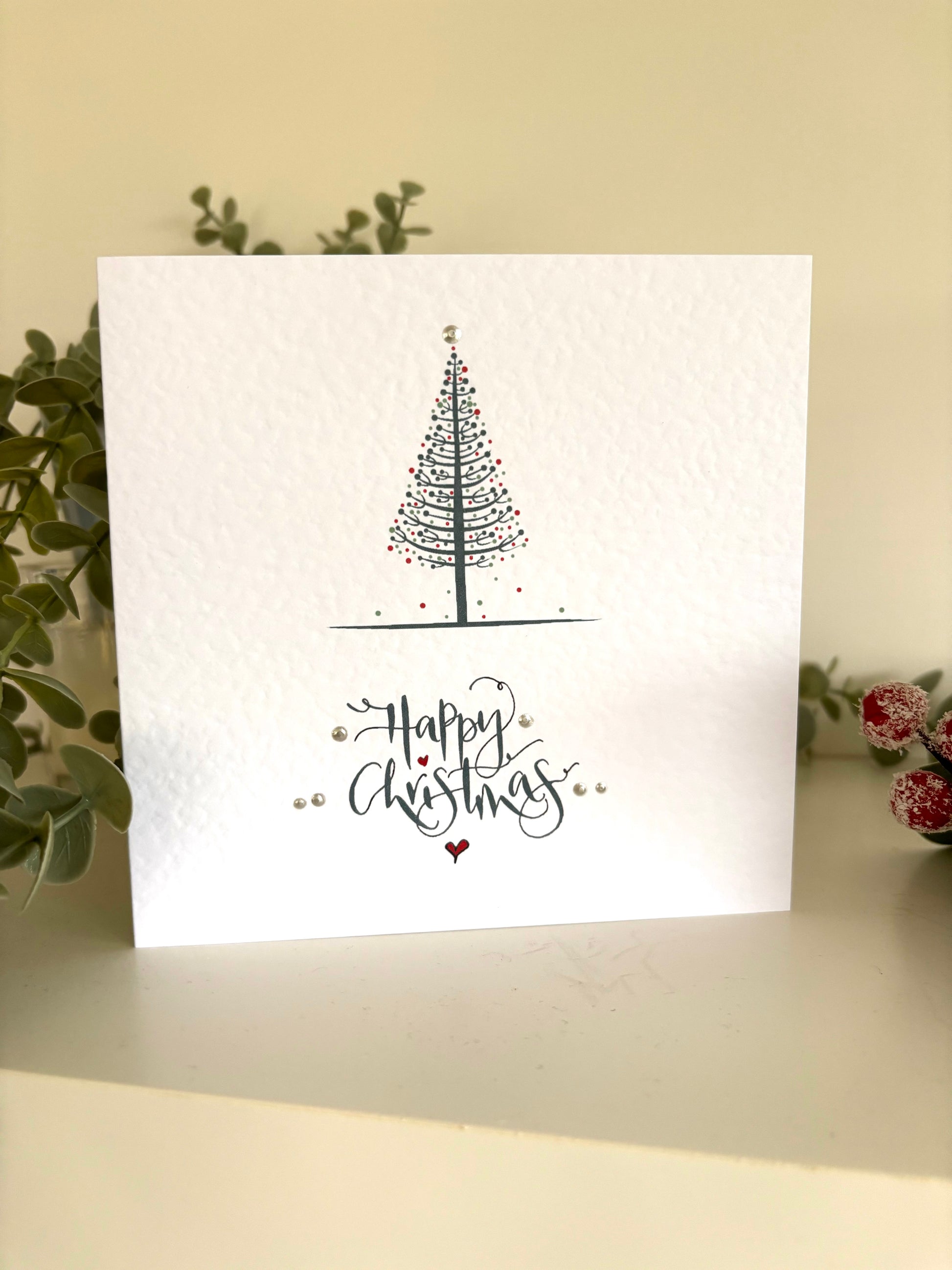 This pretty card features a simple Scandi style Christmas Tree with the wording 'Happy Christmas' writing in pen and ink modern calligraphy and is the perfect way to send your festive wishes this Christmas.