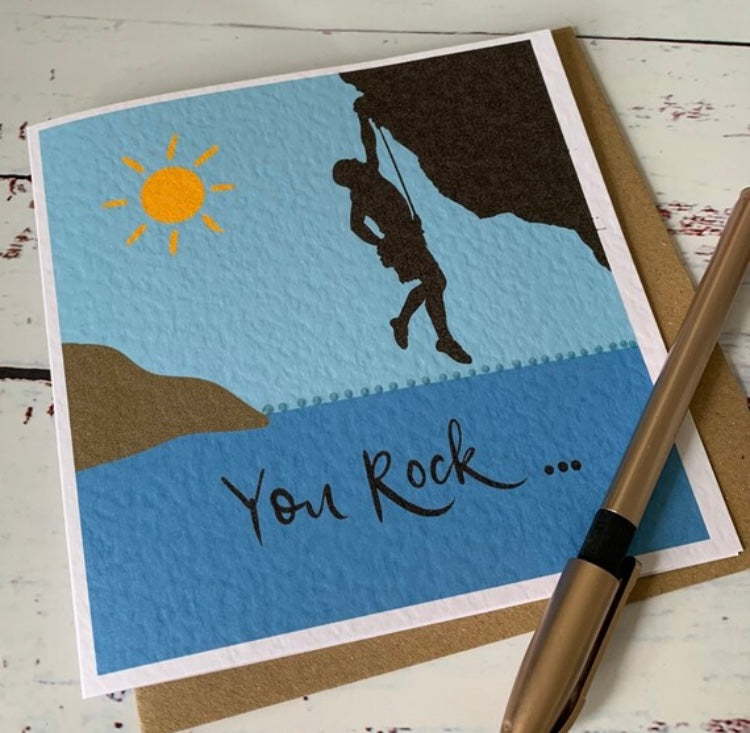 Our card features a beautiful illustration of a rock climber on an ocean cliff, and a message "You Rock" that captures the thrill and excitement of rock climbing and the celebrant's passion for it.